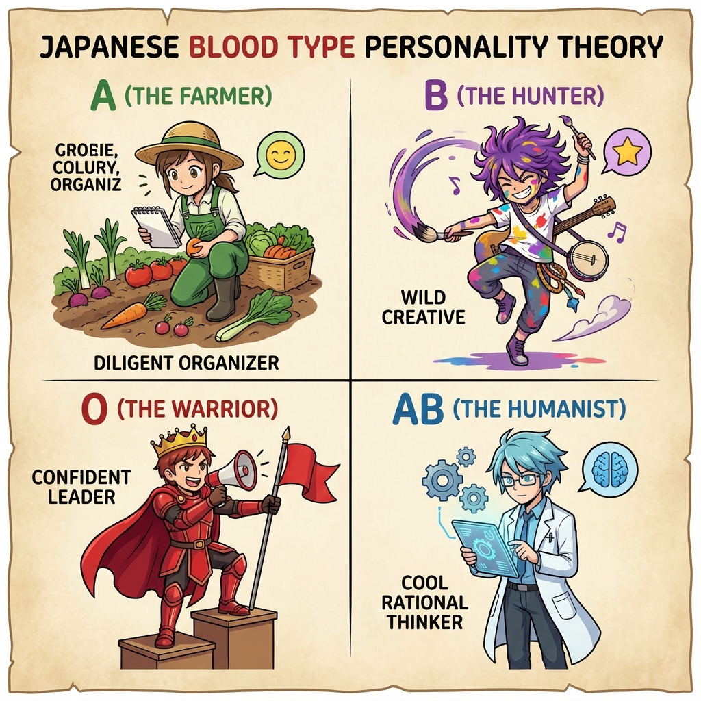 In Japan, asking "What's your blood type?" is as common as asking for someone's zodiac sign in the West. This belief, known as the "Japanese culture blood type" personality theory (Ketsuekigata), suggests that ABO blood groups predict temperament and compatibility. It influences everything from dating to job interviews!